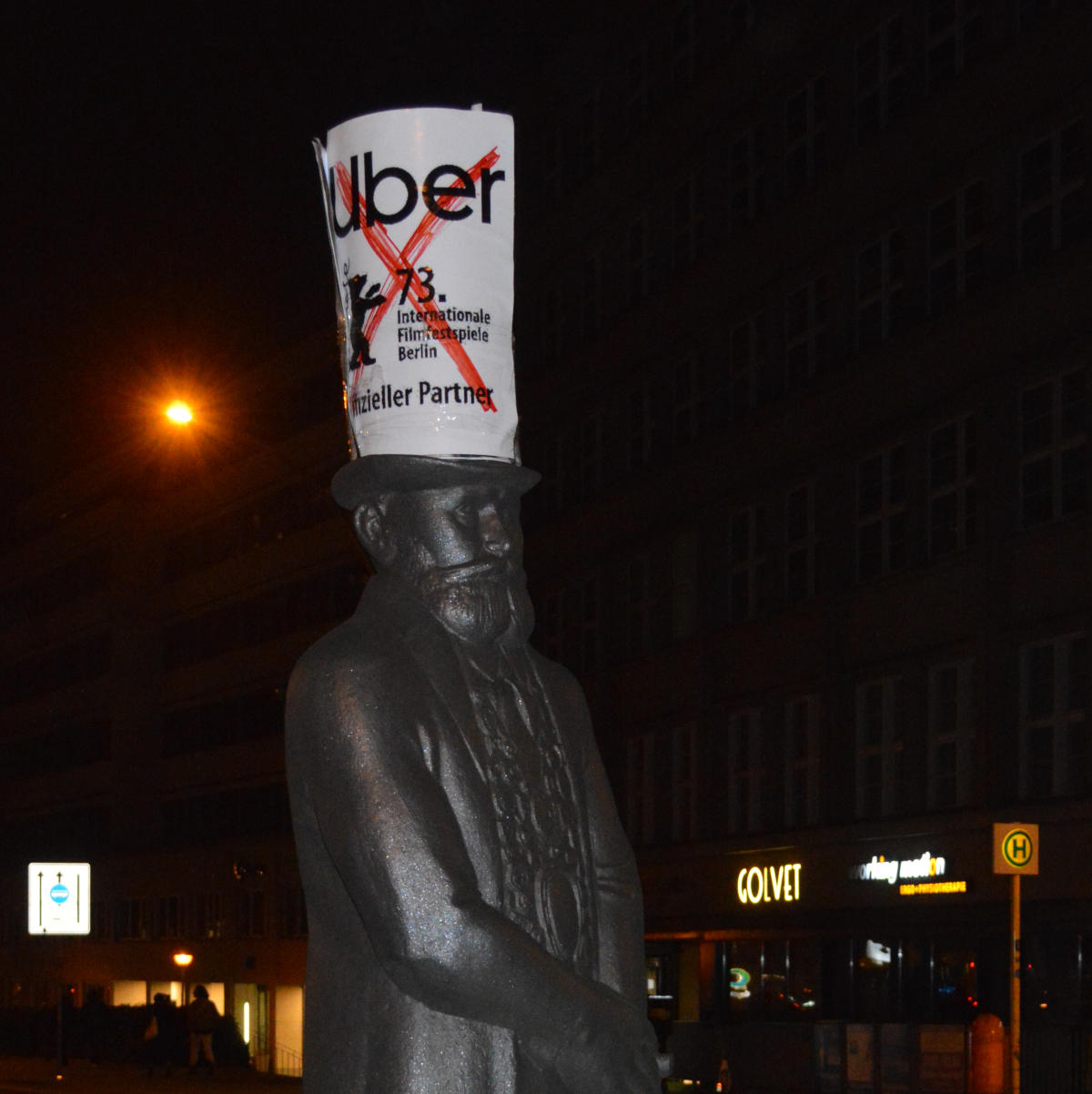 "Pünktlich zur Eröffnung der Berliner Filmfestspiele fand eine Protestaktion von Berliner TaxifahrerInnen nahe der Eröffnungszeremonie statt. Grund dafür ist, dass die mit öffentlichen Geldern finanzierte Berlinale ausgerechnet den umstrittenen Beförderungsvermittler Uber zum Hauptpartner gemacht hat. Uber fährt hier mit Elektro-Limousinen die Prominenten zum roten Teppich. Im Alltag hingegen wird mit einer Konstruktion aus Subunternehmen Taxi-ähnlicher Verkehr mit Autos der unteren Mittelklasse durchgeführt.