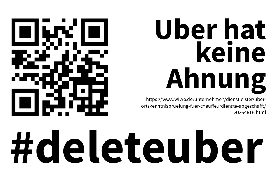 Wir stellen den frechen Behauptungen von Uber geprüfte Fakten entgegen, knallig formuliert, mit Link zur Quelle als Text und QR-Code. Uns ist sachliche Kritik immer willkommen.