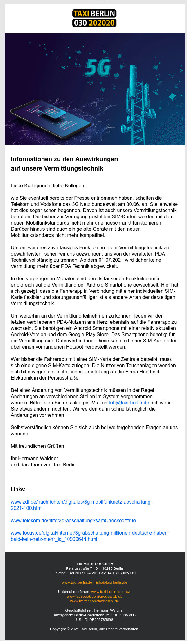 Zitat aus dem Infobrief von Taxi Berlin zur Abschaltung von 3G:
